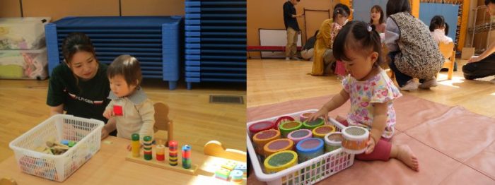 【ちびっこひろばとは??】・・・当園に在園していない1歳児~2歳児のお子様を対象に、月に一度土曜日に園を開放し、お友達と園にある遊具や玩具で遊んだり保育教諭が提供する遊びを楽しむ活動です