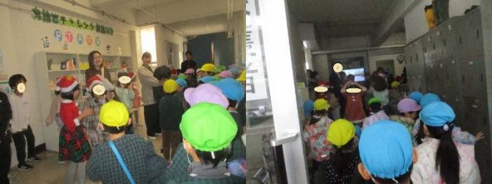 今日は年長さんが、園の隣にある大麻西小学校の交流会に出掛けてきました先日1年生からクリスマス会の招待状を頂き、大喜びで、学校で遊べるのを心待ちにしていました