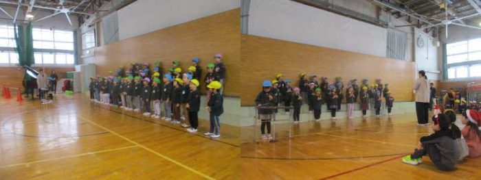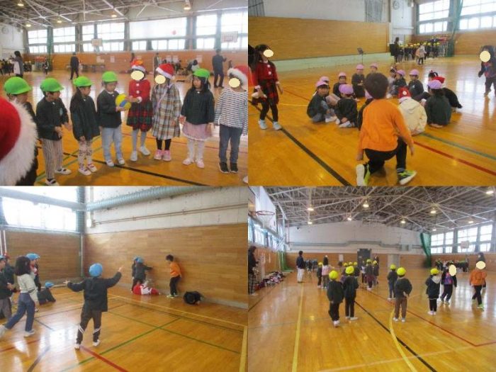 年長さんは4つのチームに分かれて、【爆弾ゲーム】【ハンカチ落とし】【だるまさんが転んだ】【おおかみさん今何時?】ゲームを行いました体を動かしたり、楽しんで参加しました最後は、ありがとうの気持ちを込めて、発表会に行ったベル演奏と言葉のプレゼントをしましたこども園を卒園した1年生の中には、「こういうの懐かしい」と言っているお友達もいました