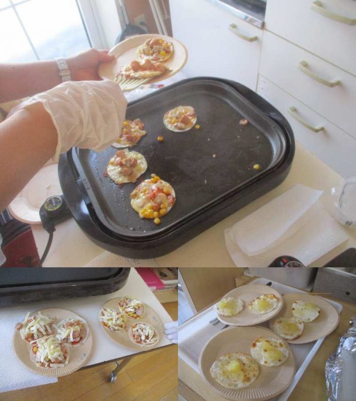 ケチャップや、コーンツナ、切ったウインナーをパラパラ餃子の皮に乗せて、チーズをかけて・・・ホットプレートで焼きます![]()